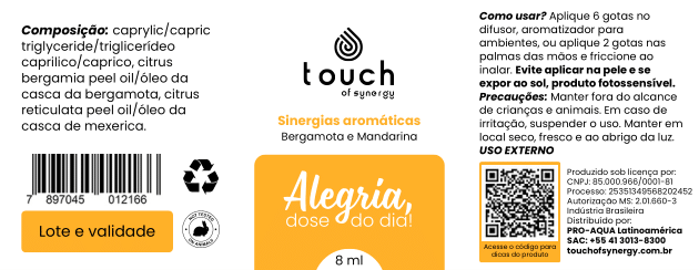 A Sinergia Alegria, Dose do Dia! da Touch of Synergy foi criada para transformar qualquer ambiente em um espaço de leveza, acolhimento e bem-estar. A Mandarina, com seu aroma suave e alegre, traz sensação de segurança e prepara o clima para momentos especiais. Já a Bergamota afasta preocupações e exaustão, atuando como um sedativo natural do sistema nervoso e espalhando positividade. Juntas, elas criam um ambiente acolhedor, perfeito para relaxar, curtir e renovar as energias.
