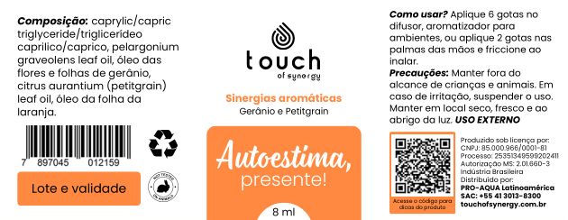 Sinergia Autoestima, presente! da Touch of Synergy: Óleo Essencial de Gerânio e Petitgrain para elevar ânimo, confiança e bem-estar. Aroma floral e leveza para o seu dia a dia!